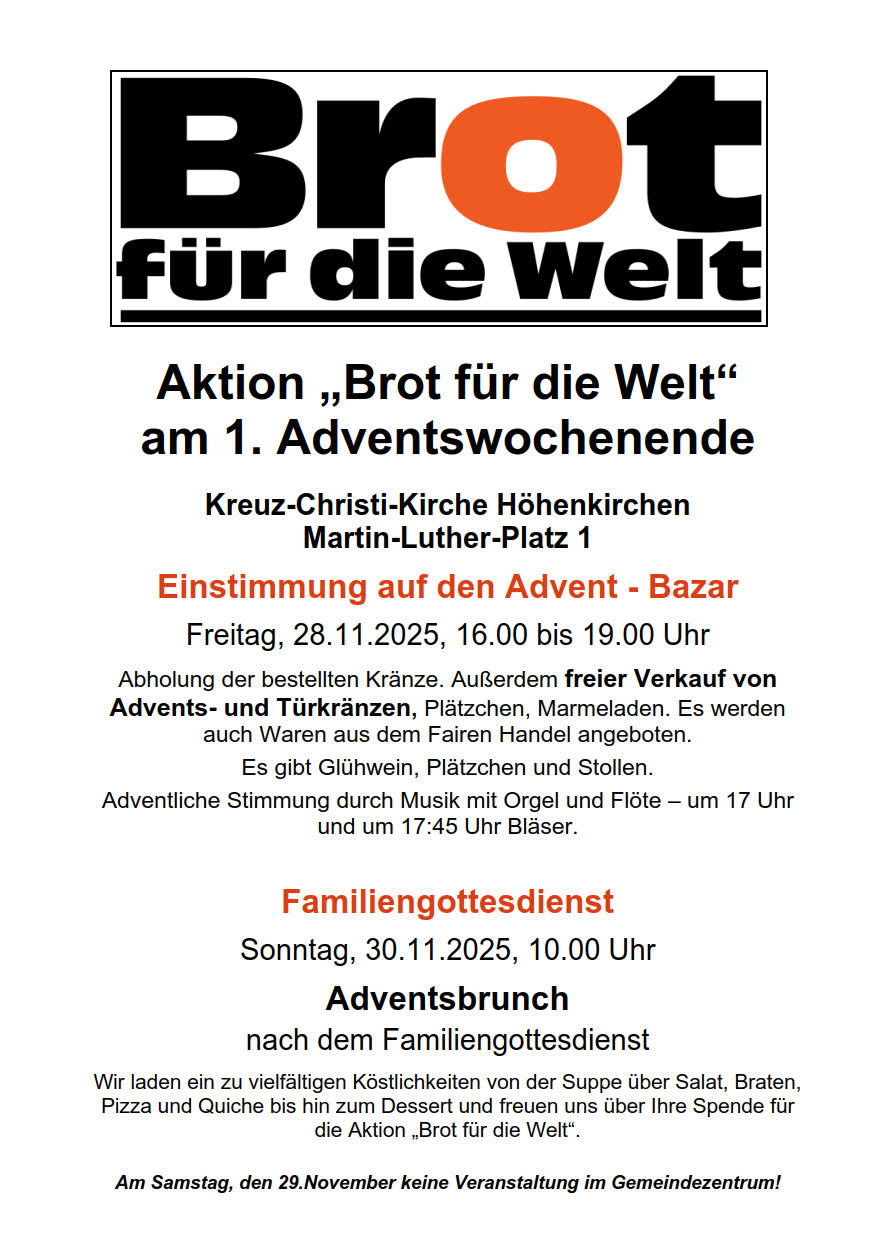 Wir sind die evangelisch-lutherische Kirchengemeinde für Höhenkirchen-Siegertsbrunn, Aying, Brunnthal, Egmating, Oberpframmern und Hohenbrunn (Luitpoldsiedlung), im Südosten von München.